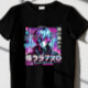 Hier ist ein animiertes und manga-inspiriert T - Shirt-Design mit einem cyberpunk-artigen Animecharakter mit leuchtenden Neonaugen, glitzernden Effekten und japanischem Text, der "Neo Tokyo" liest 🎮 🌆 ✨