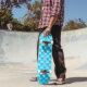 Color blocks around bright neon blue and lighter and darker shades of blue.