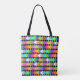 Diese Tote-Tasche hat ein geometrisches Design von Neondiamanten überlappt sich auf einem Feld schwarz.