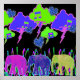 Neon Elefanten auf schwarzem Hintergrund mit Wolken, Blitz, Musik und Herzen.