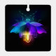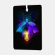 Antikes, mechanisches Feuerwerk mit Glühbirne und dünnen Flügeln glänzt orange, lila, türkis auf schwarzem Hintergrund. Steampunkstil.