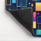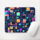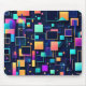 Ein chaotisches, aber optisch ansprechendes abstraktes Muster mit einer Vielzahl von bunten Quadraten, Rechtecken und Linien. Die Formen überlappen sich und überschneiden sich, was ein Gefühl für Tiefe und Bewegung schafft. Die vorherrschenden Farbtöne sind in Rosa, Orange, Gelb, Blau und lila gehalten, das Set vor einem dunklen Hintergrund. Der Gesamteffekt ist energetisch und faszinierend.