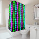 Dieser Duschvorhang hat ein modernes Design von neonrosa, grünen und blau abgerundeten Rechtecken in steigender und abnehmender Größe, die vertikal auf einem schwarzen Feld laufen.
