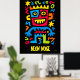 Helles Neon-Monster-Poster in lebhaftem Rot, Gelb, Blau und Grün. Ein Pop-Kunstdesign aus der Neon Noise Collection, das sich perfekt für Halloween-Partys, Kinderzimmer oder moderne, farbenfrohe Dekoration eignet.