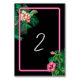 Ein modernes und dennoch Retro-Thema Neon rosa tropischen botanischen Botanicals auf einem schwarzen Hintergrund. Ein schönes Hochzeitsdesign, ideal für den Sommer. Die tropischen Pflanze in Neonrosa sind mit Palmen, Blume aus rosafarbenem Hibiskus und Blume aus Plumerias Frangipanis gestaltet. Schwarz, Rosa und Grün dominieren dieses tropisch-rosa Neondesign. Die moderne kalligraphische Typografie kontrastiert perfekt mit dem schwarz-rosa Hochzeitsdesign. Ein elegantes Hochzeitskartendesign mit modernen, einfachen Elementen. Es stehen auch passende Hochzeitsstilleriedateien und andere Hochzeitsformate zur Verfügung. Passen Sie die Anzahl an und erwerben Sie jede Tabellennummer individuell, je nachdem, wie viele Tischnummern Sie benötigen.