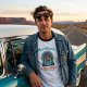 The cool Chrome & Vinyl palette keeps the artwork crisp against the white ringer tee, while the black collar and sleeve bands reinforce the mid-century throwback style. Finished with the subtle line “THE MUSIC NEVER GETS OLD,” the design celebrates the timeless connection between the open road and great music.