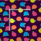 Stilvolle Rose in leuchtend neonenrosa, blau, gelb und korallenfarben mit neongrünen Blätter sind über einen lila Hintergrund gestreut, um ein lustiges Blumenmuster zu schaffen.