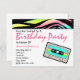 Une invitation inspirée des années 80 à la fête d'anniversaire avec une bordure d'impression zébrée au sommet avec des rayures noires et un arrière - plan d'aérographe des années 80 rose, jaune, bleu et jaune inspiré des années 80. Illustration d'une cassette en bas à droite. Personnalisez le texte rose et noir avec les détails de votre occasion.