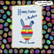 Ein farbenfroher Osterhase für Ihren Neffen in Form eines Ostereis. Das Ei ist mit Flecken, Streifen und Zickzacken in Blau, Rot und Gelb dekoriert, der Hintergrund ist blassblau. Die Botschaft im Inneren kann angepasst werden und lautet: "Ein glücklicher Osterhase ist hier, um einem besonderen Neffen ein sehr glückliches Ostern zu wünschen!"