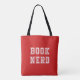 Dieses alles-über-Print Buchtasche enthält die Worte "Nerd buchen" in Weiß vor einem bearbeitbaren Hintergrund (klicken Sie auf anpassen, um die Hintergrundfarbe zu ändern). *Bitte beachten Sie, dass das Zazzle-Wasserzeichen, das in der Zoomvorschau angezeigt wird, nicht auf dem gedruckten Endprodukt angezeigt wird. © Bookish and Wonderful