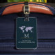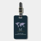 Ein schöner und blauer Gepäckanhänger mit Monogramm mit Mr. & Mrs. Name und Initial, Adresse und mit der Weltkarte... um ihr Gepäck zu identifizieren...