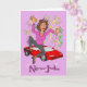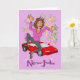 Das ist eine fröhliche Karte, um jedem Weibchen zu gratulieren, dass es gelungen ist, einen neuen Job zu bekommen. Es ist eine Cartoon-Karikatur einer lächelnden Frau, die in ihrer rosa Bluse und ihrer grauen Hose gekleidet ist. Sie hält ein goldenes Handy in der einen Hand und eine Menge Dollarnoten in der anderen. Sie springt vor Freude und hat nicht bemerkt, dass sie ein paar Dollar Scheine in ihrer Aufregung fallen gelassen hat. Hinter ihr steht ein glänzender neuer roter Sportwagen und eine Ausstellung von Feuerwerken. Der Hintergrund ist lila und der Text lila. Das Bild ist mein eigenes aus einer freehand Skizze, die manuell eingezeichnet und in Sketchbook Pro digital gescannt wurde.
