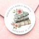 Ein süßer, runder Aufkleber für einen Baby- oder Braut-Shower mit dem Thema "Ein neues Kapitel beginnt". Das Design zeigt eine einfache Serifenschrift, die am Rand platziert ist, für ein sauberes, zeitloses Aussehen. In der Mitte befindet sich ein Wasserfarben-Stapel aus drei Büchern in Tönen von Beige, Grau und Grün, akzentuiert mit Wildblumen und Grün in Rosenrot, Gelb, Blau und Lila für ein weiches, fröhliches Gefühl.