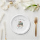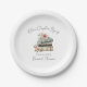 Ein süßer Pappteller für ein Baby- oder Hochzeitsbrunch mit einem buchthematischen Feiermotiv. Das Design zeigt den Satz „Ein neues Kapitel beginnt“ in einer eleganten Schwungschrift, kombiniert mit klassischen Serifenschriften, sowie einen Wasserfarben-Stapel aus drei Büchern in Tönen von Beige, Grau und Grün. Die Bücher sind mit Wildblumen und Grün in Rosenrot, Gelb, Blau und Lila akzentuiert, was einen weichen und fröhlichen Touch verleiht.