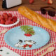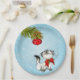 Niedliche Teller mit einem Weihnachtsthema. Eine schelhafte und verspielte weiße siamesische Katze. Sie schaut sich eine Weihnachtsbaumdekoration an, die an einem Kiefernzweig hängt und fragt sich, ob sie frech sein und damit spielen sollte oder nicht. Im Text heißt es frohe Weihnachten in einem skurrilen Schriftart. Set auf blauem Hintergrund mit weißen Schneeflocken.