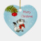 Ein lustiges und niedliches, herzförmiges Weihnachtsdekor. Eine schelhafte und verspielte weiße siamesische Katze. Sie schaut sich eine Weihnachtsbaumdekoration an, die an einem Kiefernzweig hängt und fragt sich, ob sie frech sein und damit spielen sollte oder nicht. Im Text heißt es frohe Weihnachten in einem skurrilen Schriftart. Set auf blauem Hintergrund mit weißen Schneeflocken.