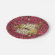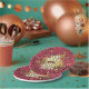 Diese neuen, seit Jahren verfügbaren, runden Party-Teller sind Set auf einem belebten, glänzenden, rosafarbenen und goldfarbenen Imitat-Folienstapel und verfügen über eine simulierte Goldstaubstruktur mit drei Haufen verwitterter Blechdruckflecken aus metallischem Messing und haben den Wortlaut "NEW YEAR SAME HOT MESS".