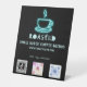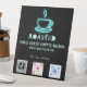Bleibe mit Kaffee/Café-Kunden mit diesem Tischfußschild, das eine neonblaue Kaffeetasse mit anpassbarem Text und QR-Codes für Social Media auf schwarzem Hintergrund enthält