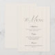Featuring delicate vertical stripes and an elegant mixed typography header, this menu blends modern editorial style with classic wedding tradition. The airy layout and warm neutral tones create a sophisticated look that pairs beautifully with gold flatware, ivory linens, and estate-style floral arrangements.