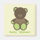Ein Baby-Duschfavorit-Magnet mit der Abbildung eines braunen gestopften Bären mit grünen Gingham Ohren und Pfoten. Im grünen Text steht "Baby Shower". Suchen Sie nach passenden Einladungen, Porto, Aufklebern und mehr in Jill's Paperie.