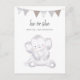 Modernes Design mit einem Babyelefanten mit grauem/brauner Fahne oben, auf dem "Er oder sie, was wird unsere Erdnuss sein?" steht. Auf der Rückseite sind unsere Einladung Vorlagen, Grün und Zauberstab mit sprudelnden Blasen.