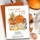 Halloween themed moving announcement. Say happy halloween and let everyone know your new address at the same time. Rustic farmhouse watercolor design in gender neutral, rich autumn colors of burnt orange, golden yellow and grey. The illustration features an orange pumpkin with sunflowers, jack o lantern and white pumpkins on a farmhouse wooden crate, decorated with fall leaves and BOO porch sign. Announcement is titled, A New Home for the Spooky Season and you can personalize the remaining wording.