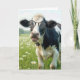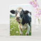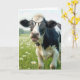 Eine schwarz-weiße Holstein-Kuh steht in einem üppigen, grünen Feld mit weißen Molsen und kaut auf einem keimenden Stamm aus Blume. Inside message kann geändert werden.