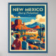 5 Sterne Reiseplakat von New Mexico (Land der Verzauberung) mit Familie und Landschaft wie Kakteen, Mesa, Wüste und Bergen in Mitte des Jahrhunderts.
