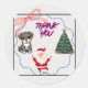A cheerful Christmas-themed design framed with a black border and accented by flowing red and blue ribbon-like lines. Inside the frame, there is a cute cartoon puppy on the left, a decorated Christmas tree with gifts on the right, and a joyful Santa Claus character at the bottom center. At the top center, the words “THANK YOU” appear in bold, artistic purple brush-style text. A red ribbon bow decorates the top left corner, adding a festive touch.