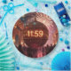 As fireworks burst in the night sky, a large metallic shiny ball shows '11:59' while a crowd gathers beneath an archway to watch the dazzling display