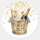 Ein moderner hallo 2025 Neujahr Party Aufkleber mit einem Eimer Champagner und vergoldeten Glitzer konfetti weißen Hintergrund. Einfache moderne Eleganz. Für jedes Jahr individuell anpassen.