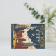 Auf dieser Postkarte finden Sie eine bezaubernde Vintage Illustration von New York City in der Nacht. Es zeigt die Freiheitsstatue und das Empire State Gebäude neben einem klassischen gelben Taxi. Das Stadtbild wird unter einem dunklen Sternenhimmel mit einem halbmondförmigen Mond beleuchtet und "NEW YORK CITY" rechts vertikal geschrieben.