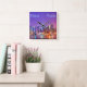 Eine quadratische Wanduhr mit der beleuchteten Skyline von NYC, gefolgt vom Text.