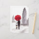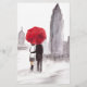 New Yorker Liebe-Paar mit rotem Schirm. Es ist ein originelles Aquarellbild von Ehepaaren in der Liebe, das von der Künstlerin Monika Howarth (ich) angestrichen wurde. Im Hintergrund ist Empire State Gebäude und New York Szene. Es ist ein regnerischer Nebel Tag in New York City.
