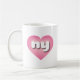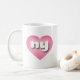 Diese Tasse hat ein rosa Herz mit einem weiß gekalkten Zentrum, das fett gerundete Kleinbuchstaben enthält, eine spielerische Version der Abkürzung für New York, den Reichsstaat.
