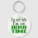Diese lustige irische Sprichwort-Schlüsselkette liest, ich bin nicht zu spät, ich bin in der irischen Zeit, mit keltischen Knüpfarbeiten Buchstaben.