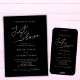 Nichts extravagant nur Liebe, moderne, minimalistische Hochzeitseinladung bietet eine elegante Schrift-Front. Es spielt mit der Einfachheit eines Schwarz-Weiß-Typografie-Designs und fügt nur einen Hauch von Pfirsichfarbe hinzu. Im Hintergrund der Einladung können Sie Ihre Hochzeitswebsite-Informationen sowie einen QR-Code für Ihre Gäste zum Scannen hinzufügen. Es ist die perfekte Wahl für Paare, die saubere und moderne Eleganz schätzen. Für besondere Designbedürfnisse können Sie sich direkt per E-Mail an choosehappystudio@yahoo.com in Touch mit dem Designer wenden.