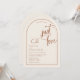 Eine elegante und moderne, erdfarbene, bogenförmige Hochzeitseinladung, die minimalistischen Text mit einem handgeschriebenen Schriftzeichen-Akzent in der Phrase "nichts extravaganter nur Liebe" enthält. Auf einem cremefarbenen Hintergrund mit Terracotta-Text und Designelementen, aber alle Elemente können nach Ihrem Thema neu gefärbt werden. © Kimbellished, LLC