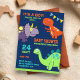 Erleben Sie Ihren Gast mit dieser coolen Babydusche-Einladung mit farbenfrohen Dinosauriern mit lebendiger Typografie vor blauem Hintergrund. Fügen Sie einfach Ihre Veranstaltungsdetails zu dieser einfach zu bedienenden Vorlage hinzu, um sie zu einer einmaligen Einladung zu machen. Dreh die Karte auf, um ein elegantes Zickzack Muster auf der Kartenrückseite zu zeigen.