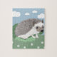 Dieses reizende Puzzle mit einem kleinen Igel, grünem Gras, blauen Himmel und Wolken.