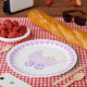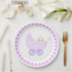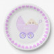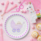 Niedliche Babywickler und Herzen in violetter Farbe auf weißer Papiertüte. Babytext kann personalisiert sein. Ideal für Party, Babygeburtstag oder Babydusche.