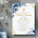 Celebra un hito sagrado con esta Invitación de Primera Comunión Azul Floral. Con bonitas flores azules de acuarela y una cruz dorada, esta invitación logra el equilibrio perfect to entre lo lindo y lo elegante. Ideal para anunciar una ceremonia de primera comunión de manera hermosa y igniativa desde el punto de vista religioso. Disponible en español. Feiern Sie einen heiligen Meilenstein mit dieser Ersten Kommunion der Blauen Flora. Mit hübschen Aquarellblumen und einem goldenen Kreuz vereint diese Einladung das perfekte Gleichgewicht zwischen Beständigkeit und Eleganz. Ideal für die Ankündigung einer gepflegten ersten Kommunion Zeremonie auf schöne und religiös bedeutsame Weise. Verfügbar auf Spanisch.