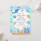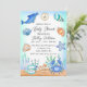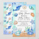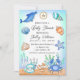 Adorable handgezeichnete Cartoon Delphin, Krabben, Muscheln, Seestern, Sand Dollar und Korallen blauen Jungen Baby Dusche Einladungen mit einem Thema Strand.