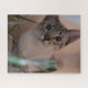 Schöne blaue mit Augen Katze, die aufmerksam auf die Kamera schaut.
