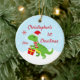Feiern Sie mit diesem niedlichen Cartoon Baby Dinosaur T-Rex (Tyrannosaurus Rex) Weihnachtsschmuck, in dem ein Cartoon-grüner Baby-Dinosaurier mit einem festlichen Weihnachtsgeschenk in Rot zu sehen ist. Personalisieren Sie dieses magische Ornament, indem Sie den Namen und das Geburtsjahr des Babys ändern. Kann auch angepasst werden, indem 1. Weihnachten auf 2. oder 3. oder irgendwas geändert wird; sonst etwas, um dies zu einer besonderen Weihnachtsbaumdekoration zu machen. Gut, um als Geschenk an Eltern zum ersten Mal oder als Keepsake zu kaufen.
