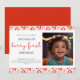 Niedliches und einfaches Foto Beerengebäck zum ersten Geburtstag, horizontale Einladung mit Erdbeermuster. Diese Einladung wurde illustriert und von Patricia Alvarez entworfen.
