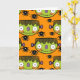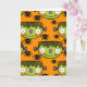 Ein niedliches Halloween-Bild mit einem Cartoon Frankenstein (grün, natürlich!) auf orangefarbenem Hintergrund, mit seinem kleinen verschwommenen schwarzen Spinnenfreund. Ideal für Kinder.