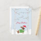 Eine niedliche Weihnachts-Dackel-Postkarte für die Winterferien-Saison. Das Design zeigt Weihnachtsleuchten, die um Bäume gewickelt sind, und einen Dackel-Hund, der eine rote Weihnachtsmannmütze im Schnee trägt.