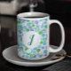 Diese niedliche Froschkunst Kaffee-Tasse hat ein Monogramm und handgezeichnete grüne Frösche mit grünen, blauen und lila Wasserlilien auf hellblauem Hintergrund. Passen Sie das Design an, indem Sie das erste bearbeiten, um es zu personalisieren. Es ist ein schicke, mädchenhaftes Design, das eine nette Ergänzung zu Ihrer Morgenkaffee-Routine sein wird. Ideal für Amphibienliebhaber!