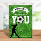 Sportbezogene Valentinstag-Karte mit grünem Rasen-Fußball-Hintergrund, Ihren Valentinennamen, eine Silhouette eines Fußballspielers und das niedliche Sprichwort "I get a kick out of you" mit einem Fußball als Buchstaben O.